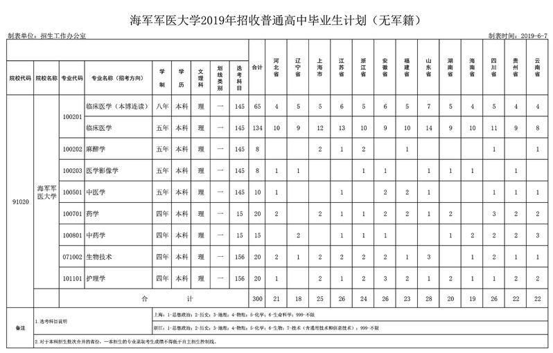 【招生计划】2019年海军军医大学招收普通高中毕业生计划(无军籍)